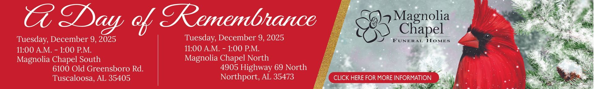 Our Northport funeral home and Tuscaloosa funeral home offer a full range of traditional and cremation services and pre-arrangement plans to accommodate the final wishes of the deceased. Our cemetery provides a variety of unique memorialization options including in-ground burial, above ground entombment and cremation memorial services. The ability for a family to host the entire service at one location is just one of the conveniences at Magnolia Chapel Funeral Homes.